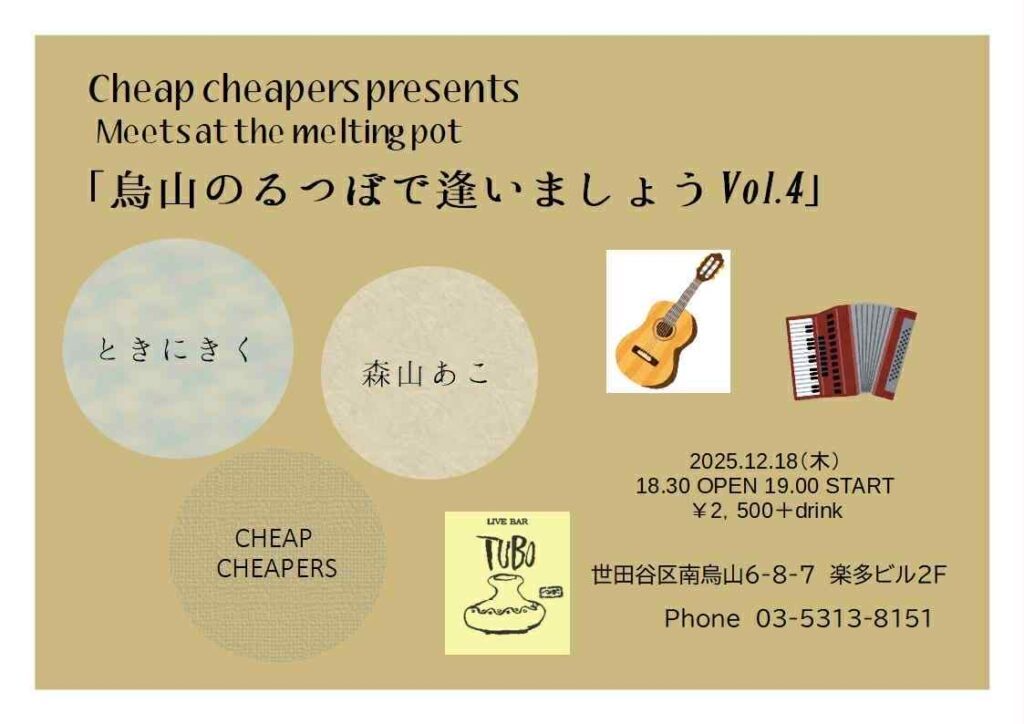HP:http://www.pazzo-di-pizza.com/pizzeria.html出演大田誠師森山あこ時間op 20:30 st 21:00chargeピザ屋の食事付き¥2500(予約限定)地図
